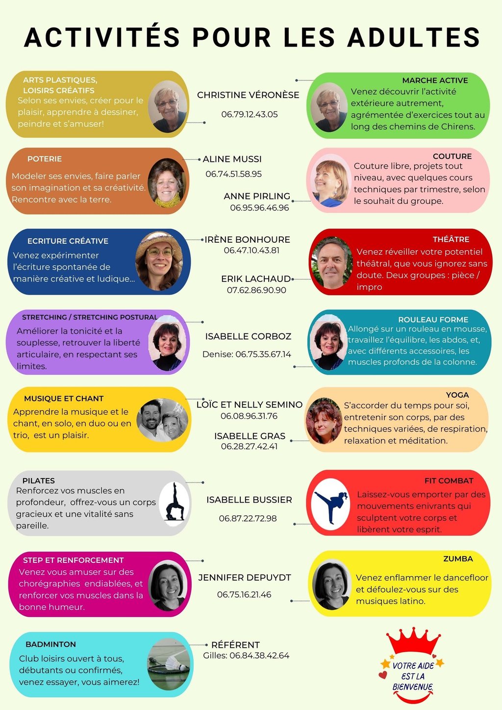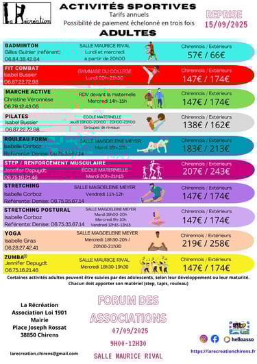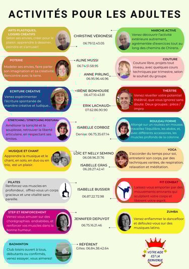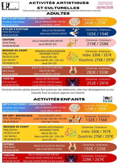 Les activités 2025-2026 sont là! Venez découvrir les activités pour les enfants : Poterie, Théâtre, Musique et chat, hip-hop, et Arts plastiques et loisirs créatifs. Pour les adultes : Arts plastiques et loisirs créatifs, Marche active, Poterie, Couture, Ecriture créative, Théâtre, Stretching/Stretching postural, Rouleau forme, Musique et chant, Yoga, Pilates, Fit combat, Step et renforcement, Zumba et enfin badminton!